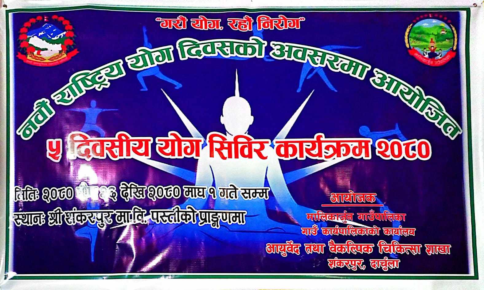 शिक्षा विज्ञान प्रविधि मन्त्रालय र संघीय मामिला तथा सामान्य प्रशासन मन्त्रालयले राष्ट्रिय योग दिवसलाई साताव्यापी रुपमा मनाउने परिपत्र बमोजिम गाउँपालिकाले आयुर्वेद तथा बैकल्पिक चिकित्सा शाखाको आयोजनामा पाचँ दिने योग शिविरको आयोजना गरेको गाउँपालिका अध्यक्ष हिरा सिंह धामीले बताए ।