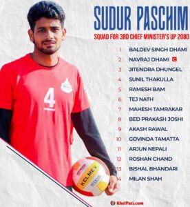 दार्चुला – दार्चुलाका खेलाडी नवराज धामी सुदूरपश्चिम प्रदेश भलिबलका कप्तान बनेका छन । दार्चुला जिल्लाको शैल्यशिखर नगरपालिका–२ देथलामा जन्मेका धामी सुदूरपश्चिम प्रदेश भलिबलका कप्तान बनेका हुन । सानैदेखि भलिबल खेल्दै आएका धामी पछिल्लो समय निक्कै उकृष्ट प्रदर्शन गर्दै आएका छन् ।