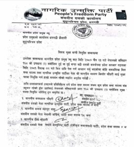 प्रदेश प्रमुख मियाले भने नागरिक उन्मुक्ति पार्टीकी सांसद इन्दिरा गिरीलाई पार्टीले कारबाही गरेको जानकारीसहितको पत्र प्रदेशसभाबाट प्राप्त भएकाले आफूले कानुनी परामर्शपछि मात्र निर्णय लिने जवाफ दिएका छन् ।