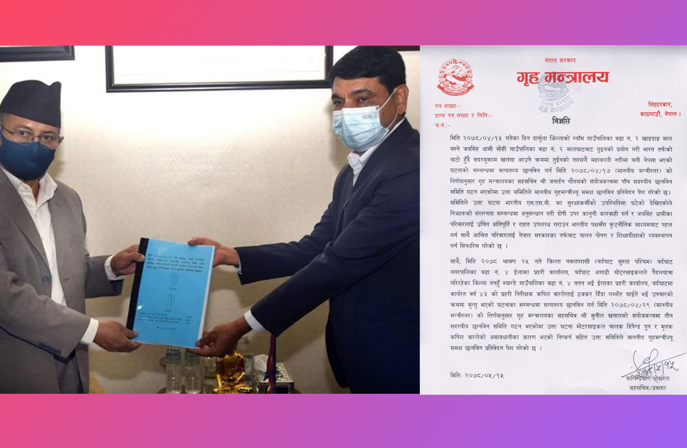 गृह मन्त्रालयका सहसचिव जनार्दन गौतमको संयोजकत्वमा गठित समितिले तयार पारेको प्रतिवेदनमा एसएसबीको संलग्नतामा पुनः अनुसन्धान गर्न र दोषीलाई कारबाही गर्न सिफारिश गरेको छ । समितिले एक महिना लगाएर तयार पारेको प्रतिवेदन हिजो गृहमन्त्री बालकृष्ण खाँणलाई बुझाएको छ ।
