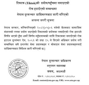 प्राधिकरणले साउन ६ गतेको मन्त्रिपरिषद्को निर्णयअनुसार टिकटक खुला गर्न सबै इन्टरनेट सेवा प्रदायक र मोबाइल सेवा प्रदायकहरूलाई निर्देशन जारी गरिसकेको उक्त सूचनामार्फत जनाएको छ ।
