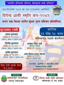 दार्चुला– दार्चुलाको मालिकार्जुनमा दिपेन्द्र धामी स्मृति प्रतिस्ठानले वडा स्तरीय खुल्ला पुरुष भलिबल प्रतियोगिता आयोजना गर्ने भएको छ । मालिकार्जुन गाउँपालिका –३ प्रेम नगर(मड)मा दिपेन्द्र स्मृति भलिबल प्रतियोता आयोजना हुन लागेको हो ।