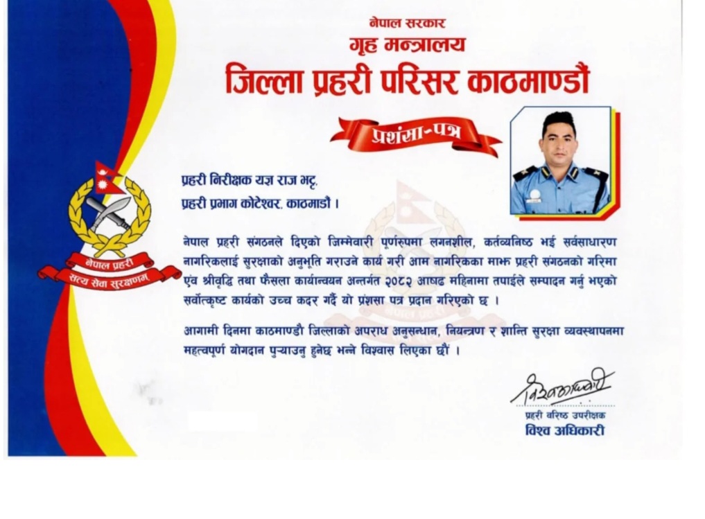 काठमाडौं जिल्ला प्रहरी परिसरले असार महिनाभरि अपराध नियन्त्रण, जनसुरक्षा तथा कानुन कार्यान्वयनमा भट्टको नेतृत्वमा प्रभागले पु¥याएको योगदानलाई उच्च मूल्याङ्कन गर्दै उनलाई विशेष सम्मानस्वरूप प्रशंसा पत्र प्रदान गरेको हो।
