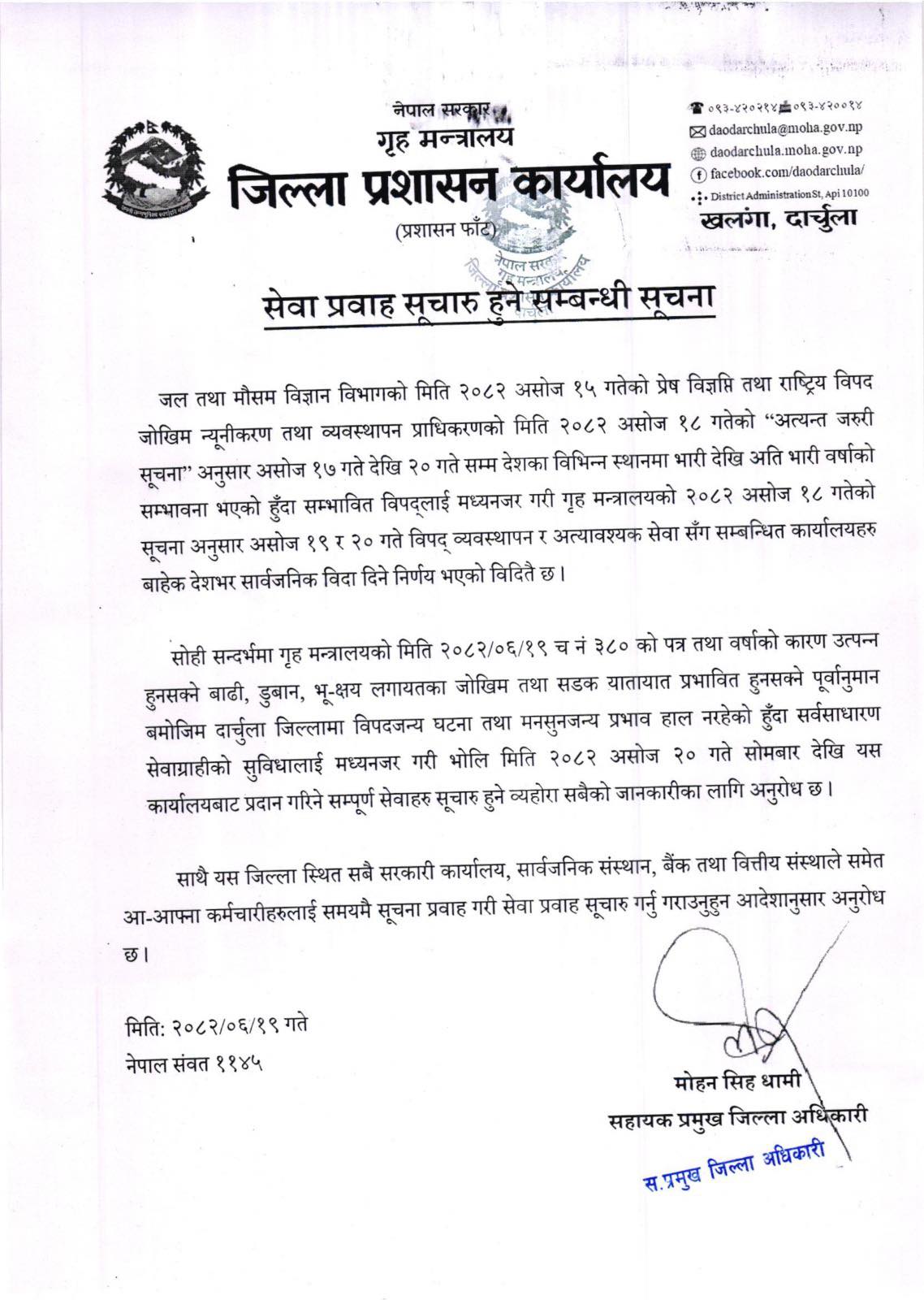 जिल्लामा विपदजन्य घटना तथा मनसुनजन्य प्रभाव हाल नरहेकाले सर्वसाधारण सेवाग्राहीको सुविधालाई मध्यनजरगदैँ आजबाट सबै सेवाहरु सूचारु हुने जिल्ला प्रशासन कार्यालय दार्चुलाका सहायक प्रमुख जिल्ला अधिकारी मोहन सिह धामीले जानकारी दिए ।