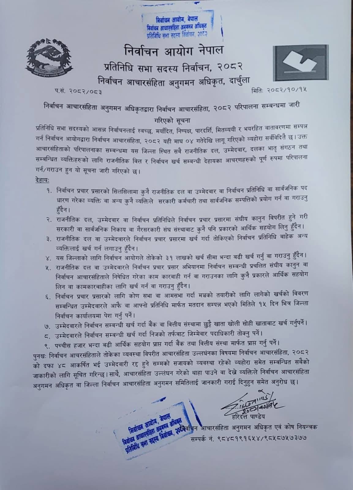निर्वाचन प्रचार—प्रसारको लागि कोण सभा वा आम सभा गर्दा मंञ्चको तयारीका लागि लागेको खर्च विबरण सम्बिन्धित उम्मेदवार वा प्रतिनिधि मार्फत निर्वाचन सम्पन्न भएको १५ दिनपछि जिल्ला निर्वाचन कार्यालयमा पेश गर्न निर्देशन दिएको छ । आगामाी फागुन २१ गते हुने प्रतिनिधि सभा सदस्य निर्वाचनका लागि दार्चुलामा एघार राजनितिक दलबाट ११ जना उम्मेदवारहरु चुनावी मैदानमा उत्रिएका छन् ।
