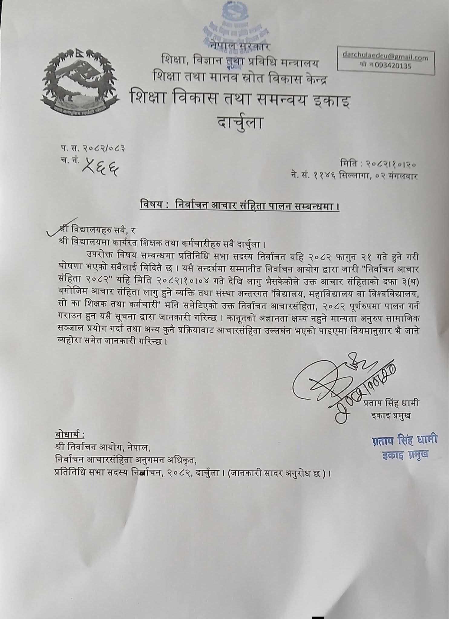 दार्चुला । शिक्षा विकास तथा समन्वय इकाइ कार्यालय दार्चुलाले निर्वाचन आयोगको आचारसंहिता विपरीत कुनै पनि कार्य नगर्न निर्देशन दिएको छ ।