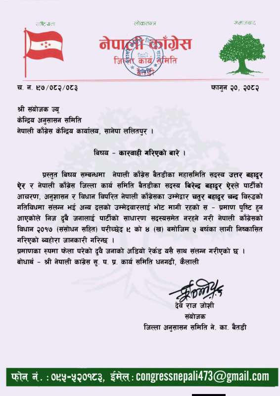पार्टीको आचरण, अनुशासन र विधान विपरित कांग्रेस उम्मेदवार चतुर बहादुर चन्दविरुद्धको गतिविधिमा संलग्न भई अन्य दलको उम्मेदवारलाई मत मागेको भन्दै कारबाहीमा परेका हुन्। कारबाहीमा परेका दुबैजना दाजुभाई हुन्।