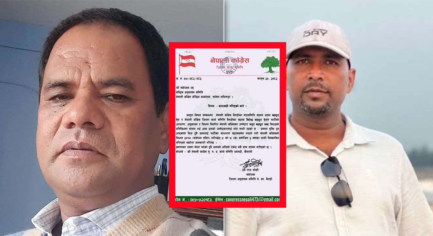 बैतडी । नेपाली कांग्रेसले बैतडीका महासमिति सदस्य उत्तर बहादुर ऐर र जिल्ला कार्य समिति सदस्य बिरेन्द्र बहादुर ऐरलाई कारबाही गरेको छ।