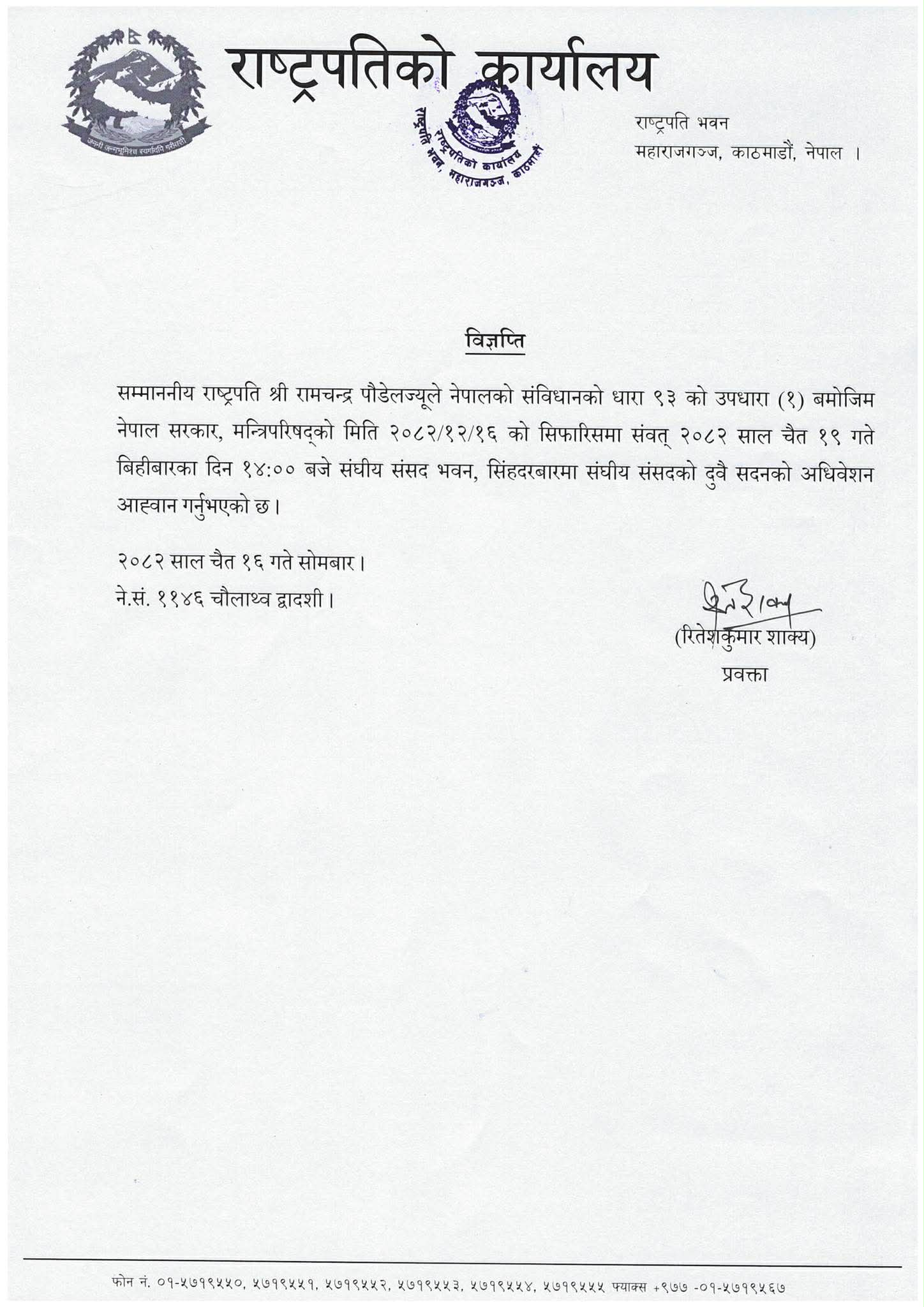 राष्ट्रपतिद्वारा बिहीबार संसद बैठक आह्वान मालिकार्जुन खबर प्रकाशितः २०८२ चैत्र १६, सोमबार १९:०७ काठमाडौं । राष्ट्रपति रामचन्द्र पौडेलले यही चैत १९ गते संसद बैठक आह्वान गरेका छन् ।