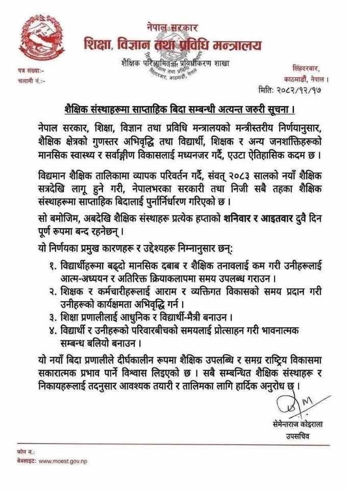 काठमाडौँ । शिक्षा, विज्ञान तथा प्रविधि मन्त्रालयले शैक्षिक संस्थाहरूमा साताको दुई दिन सार्वजनिक बिदा हुने भनी सामाजिक सञ्जालमा फैलिएको सूचना पूर्णत: भ्रामक र कपोलकल्पित रहेको स्पष्ट पारेको छ।