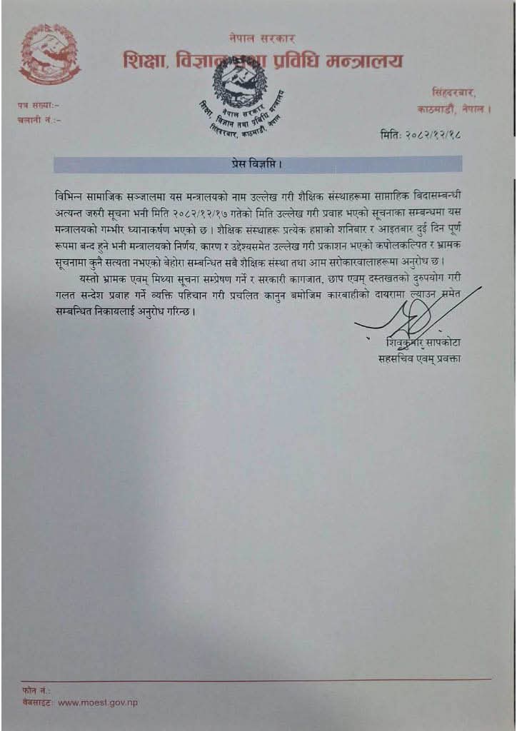 मन्त्रालयका सहसचिव एवं प्रवक्ता शिवकुमार सापकोटाद्वारा जारी प्रेस विज्ञप्तिमा उक्त सूचनामा कुनै सत्यता नभएको उल्लेख गरिएको छ। मन्त्रालयको निर्णय, कारण र उद्देश्यसमेत उल्लेख गरी आधिकारिक जस्तो देखिने गरी बनाइएको सो सूचनाले आम विद्यार्थी, अभिभावक र शैक्षिक संस्थाहरूमा अन्योल सिर्जना गरेको भन्दै मन्त्रालयले यस्ता भ्रामक कुराको पछि नलाग्न सबैमा अनुरोध गरेको छ ।