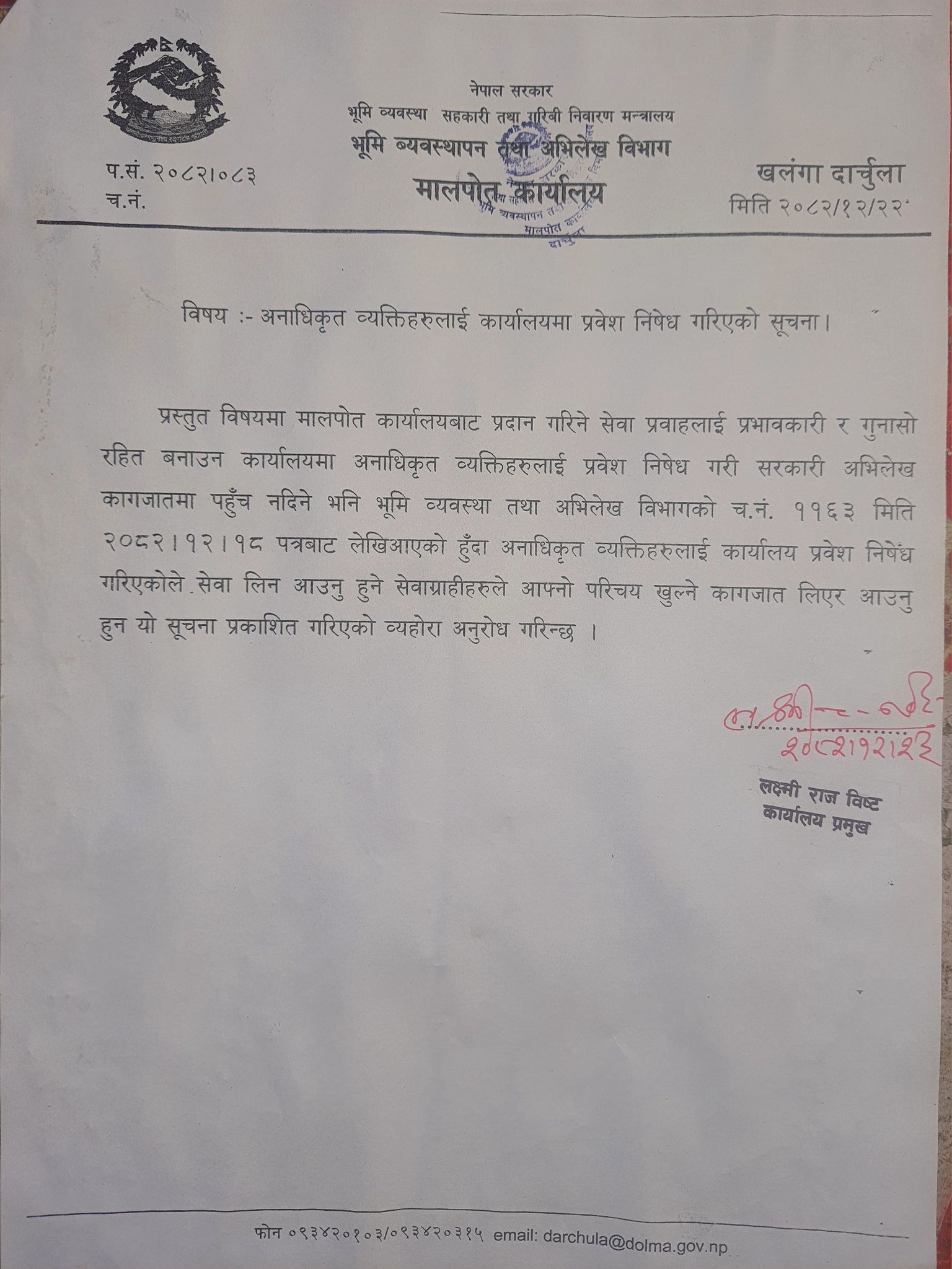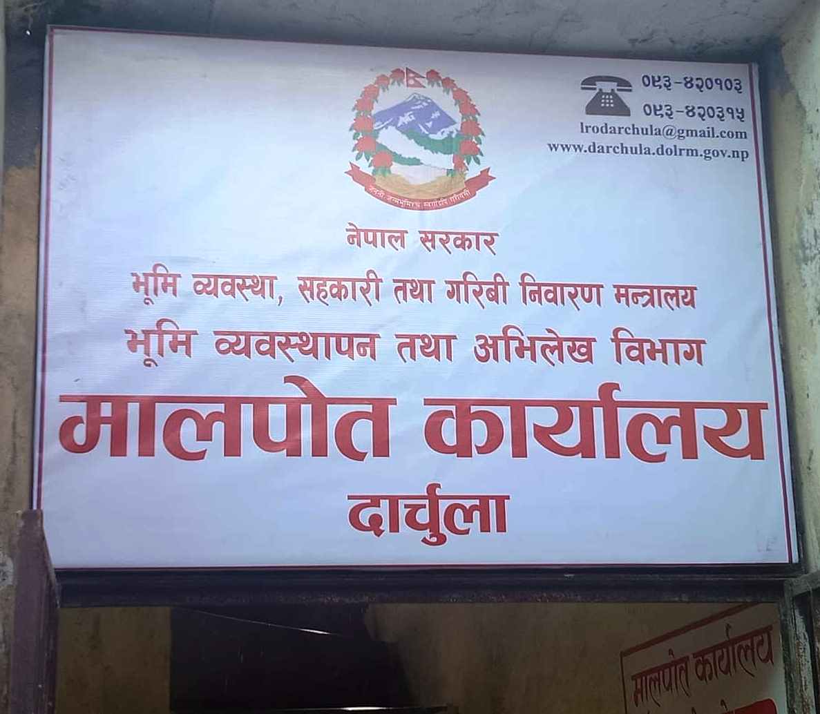 दार्चुला । जिल्ला मालपोत कार्यालय दार्चुलाले बिचौलियालाई कार्यालय प्रवेशमा निषेध गरेको छ । कार्यालयले एक सूचना जारी गर्दै अनाधिकृत व्यक्तिहरू (बिचौलिया) लाई कार्यालय परिसरमा प्रवेश निषेध गरिएको जानकारी दिएको छ ।