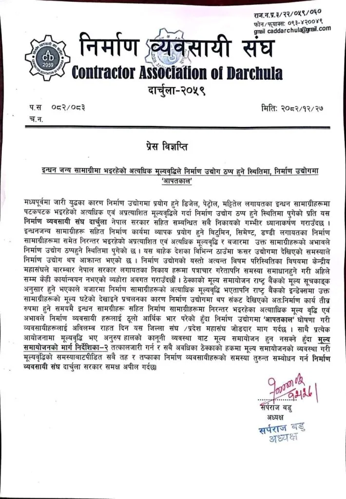 दार्चुला। दार्चुला निर्माण व्यवसायी संघले इन्धन तथा निर्माण सामग्रीको निरन्तर मूल्यवृद्धिका कारण जिल्लाको निर्माण क्षेत्र गम्भीर संकटमा परेको जनाएको छ। संघले गत शुक्रबार जारी गरेको प्रेस विज्ञप्तिमा वर्तमान अवस्था कायमै रहे निर्माण उद्योग नै ठप्प हुने चेतावनी दिएको हो।