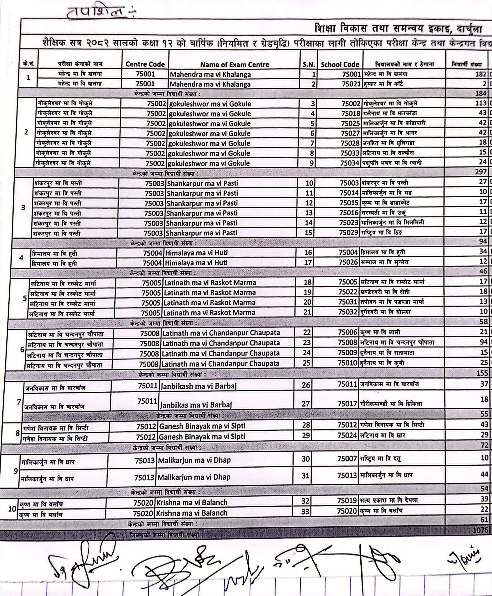 सबै केन्द्रहरू मिलाएर जिल्लाभर कुल १,०७६ विद्यार्थी परीक्षामा सहभागी हुनेछन्। शिक्षा विकास तथा समन्वय इकाइले तोकिएका केन्द्रहरूमा व्यवस्थित र मर्यादित रूपमा परीक्षा सञ्चालन गर्न आवश्यक तयारी पूरा भएको जनाएको छ। साथै, परीक्षालाई निष्पक्ष र शान्तिपूर्ण बनाउन सबै सरोकारवालालाई सहयोग गर्न आग्रह गरिएको छ। परीक्षा बैशाख १४ गतेबाट संञ्चालन गरिने भएको छ ।