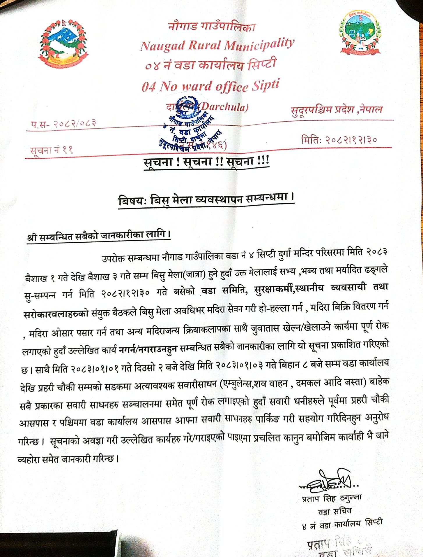 दार्चुला । नौगाड गाउँपालिका–४, सिप्टीले विषु मेला व्यवस्थापन सम्बन्धमा कडा निर्देशन जारी गरेको छ। वडा कार्यालयले सूचना जारी गर्दै मेला अवधिभर मदिरा सेवन, बिक्री–वितरण तथा हो–हल्ला गर्ने जस्ता गतिविधि पूर्ण रूपमा प्रतिबन्ध गरिएको जनाएको छ।