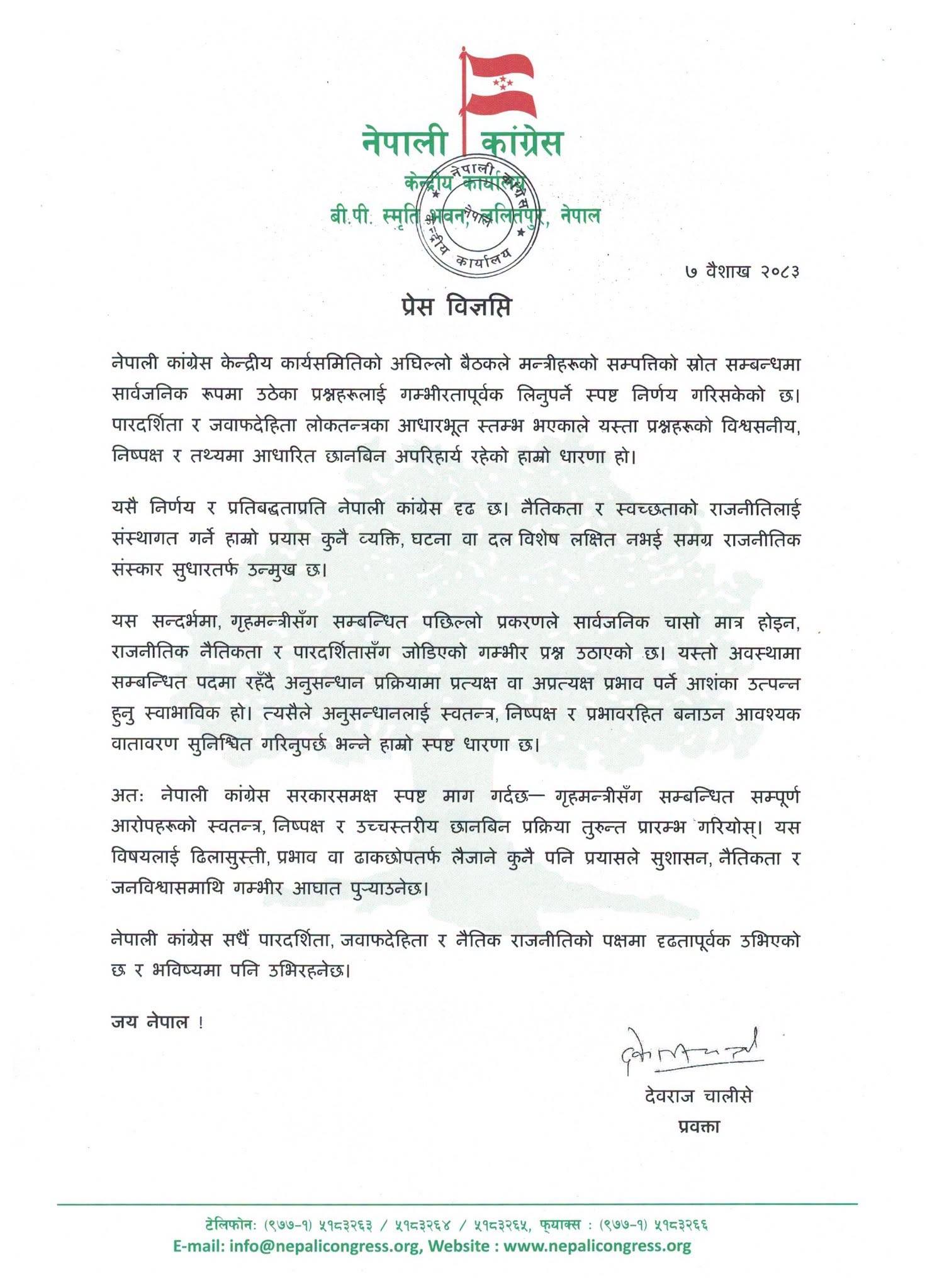 विज्ञप्तिमा अगाडि उल्लेछ, ‘अत: नेपाली कांग्रेस सरकारसमक्ष स्पष्ट माग गर्दछ– गृहमन्त्रीसँग सम्बन्धित सम्पूर्ण आरोपहरूको स्वतन्त्र, निष्पक्ष र उच्चस्तरीय छानबिन प्रक्रिया तुरुन्त प्रारम्भ गरियोस् ।’