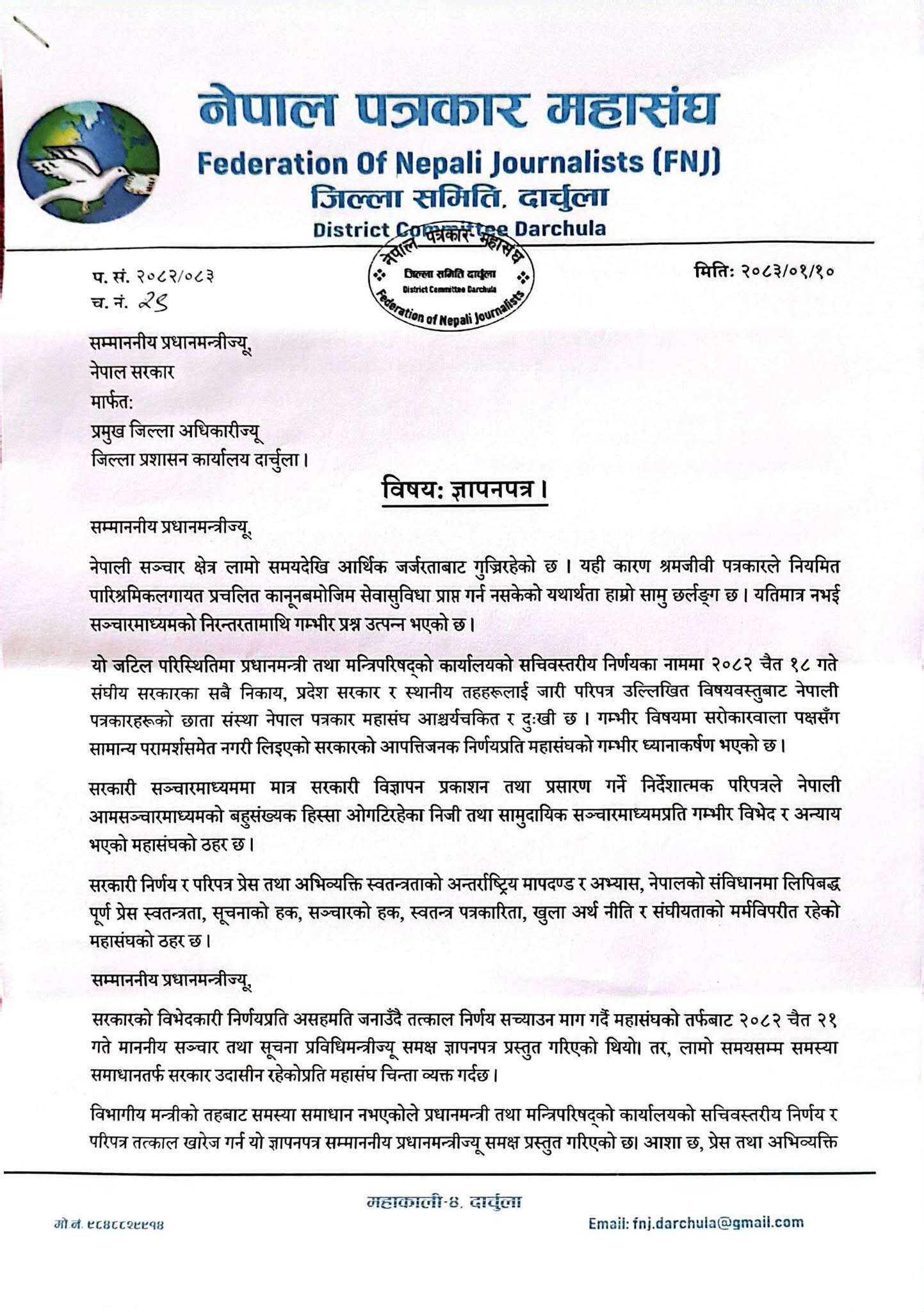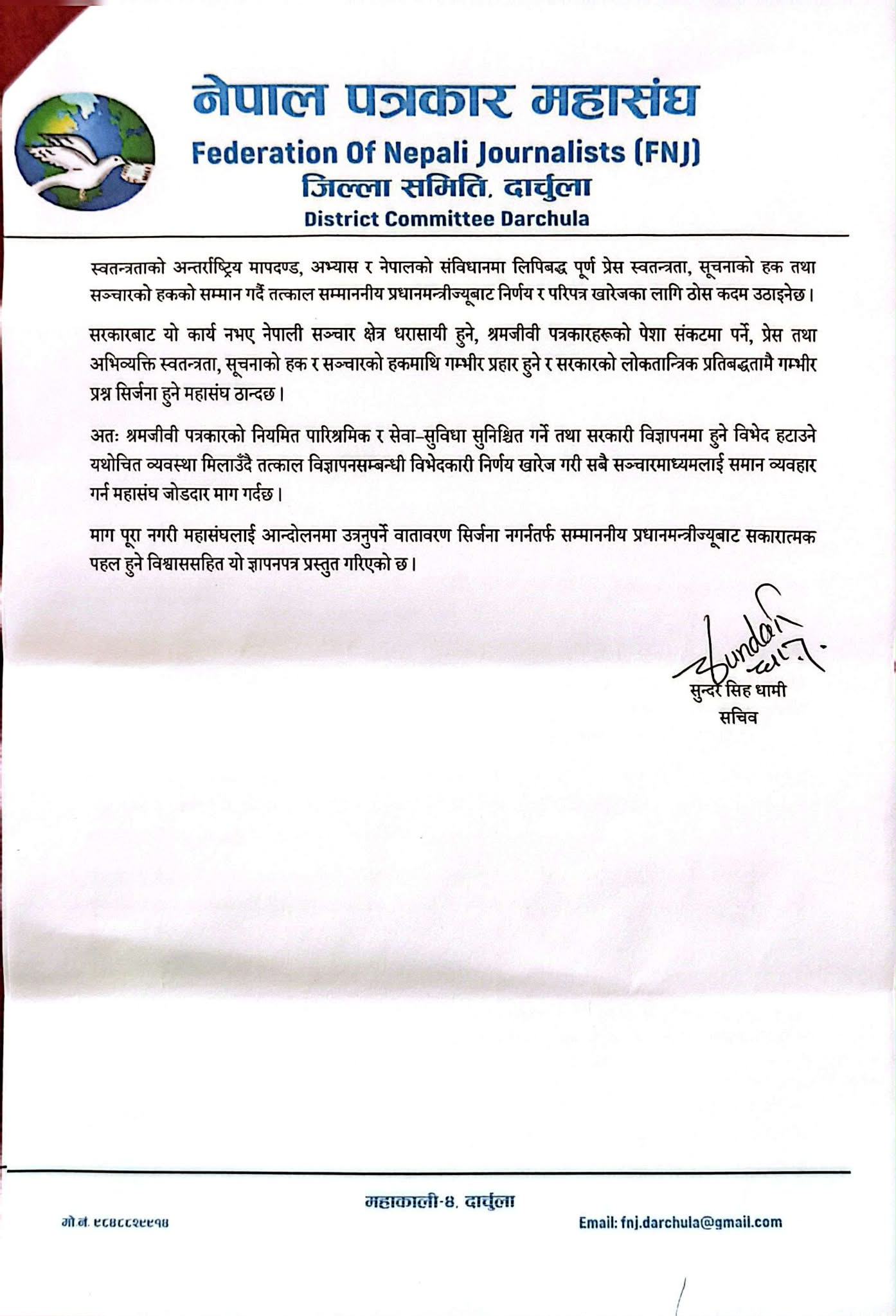 महासंघले प्रमुख जिल्ला अधिकारी मार्फत प्रधानमन्त्रीलाई ज्ञापनपत्रमा नेपाली सञ्चार क्षेत्र लामो समयदेखि आर्थिक संकटबाट गुज्रिरहेको उल्लेख गर्दै श्रमजीवी पत्रकारहरूले कानुनबमोजिम सेवा–सुविधा र पारिश्रमिक पाउन नसकेको यथार्थ औंल्याएको छ। नेपाल पत्रकार महासंघ जिल्ला समिति दार्चुलाका सचिव सुन्दर सिह धामीले यसले सञ्चारमाध्यमको दिगोपन र पत्रकारिताको निरन्तरतामाथि गम्भीर असर परेको बताएका छन् ।