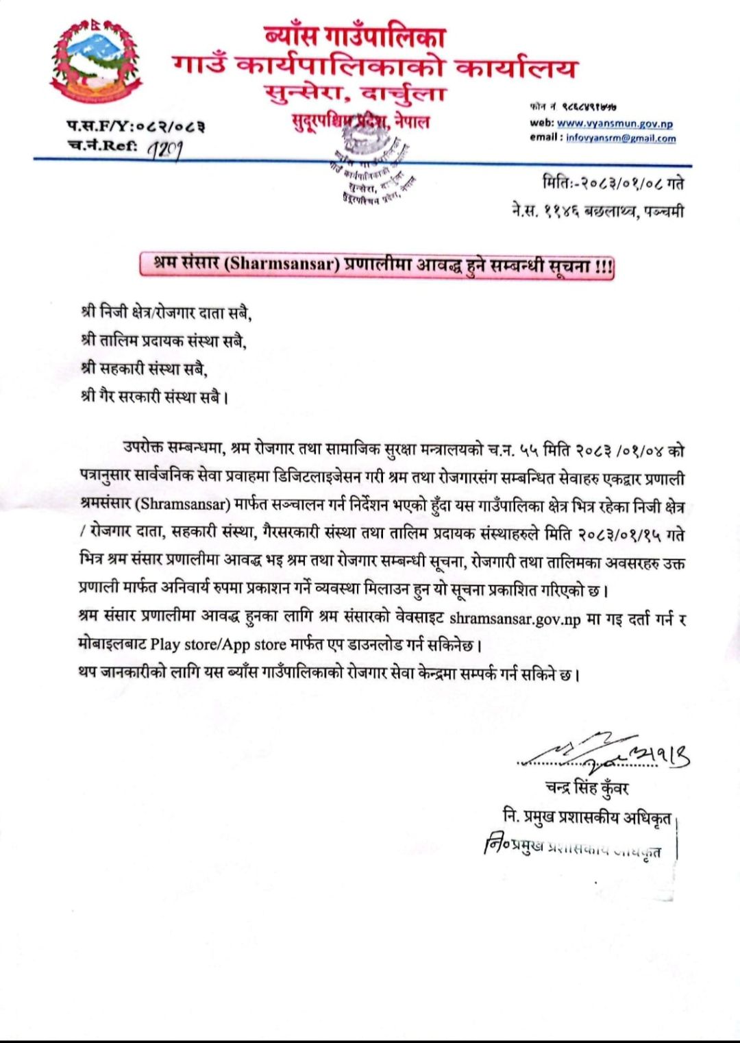 सोहीअनुसार गाउँपालिकाभित्र रहेका सम्बन्धित सबै संस्थाहरूले निर्धारित मितिभित्र उक्त प्रणालीमा दर्ता भई श्रम तथा रोजगारसम्बन्धी सूचना, रोजगारीका अवसर तथा तालिमसम्बन्धी विवरण अनिवार्य रूपमा प्रकाशन गर्नुपर्ने जनाइएको छ।